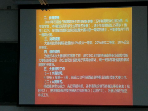 2018年3月8日,我院副院长张成现和实验实训中心李小奎老师,参加了全省高职院校技能大赛动员大会,会后我院精心组织,狠抓落实。