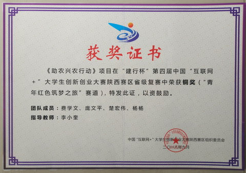 2018年9月9日,第四届中国“互联网+”大学生创新创业大赛陕西赛区省级复赛在西安理工大学落下帷幕。我院学生王继鹏、何依航、李敏、刘特儿、杨男、李甜甜、任杨荣7名同学负责的“饭跑跑生活服务平台”项目荣获省赛(主赛道)铜奖;学生费学文、杨杨、崔宏伟、庞文平4名同学负责的“助农兴农行动项目”(青年红色筑梦之旅)赛道获得铜奖。