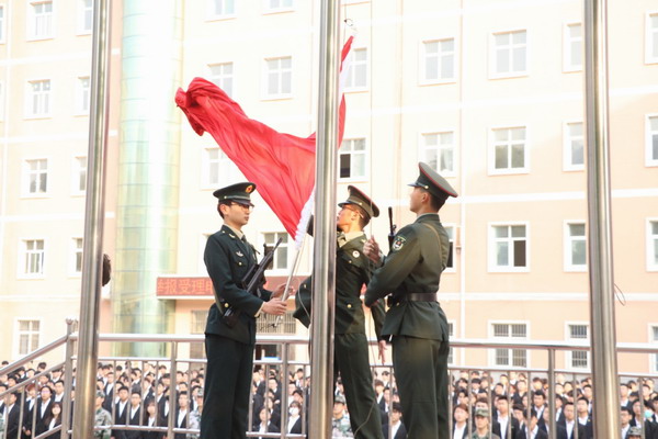 在全体师生行注目礼下,国旗护卫队队员们护送鲜艳的五星红旗,行礼完毕,伴随着庄严的《中华人民共和国国歌》,五星红旗冉冉升起,迎风飘扬。在场的每一个人向国旗行注目礼,深怀对祖国无限的热爱和崇高的敬意。