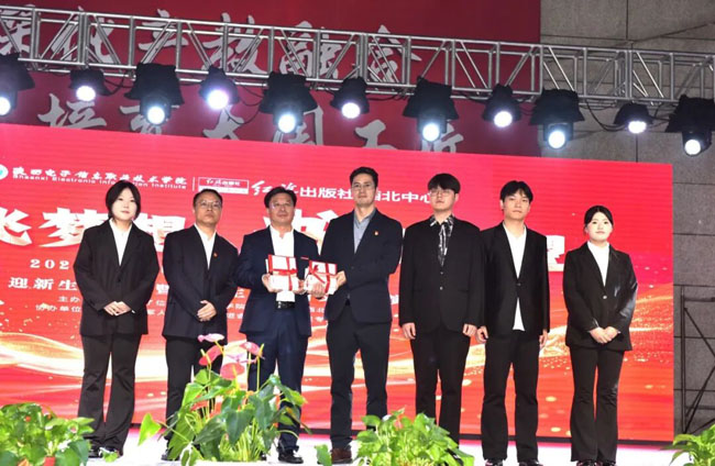 晚会过半,图书捐赠环节悄然登场。红旗出版社西北中心副主任郭哲向学院理事长、院长王明星捐赠红色经典书籍与专业教材。