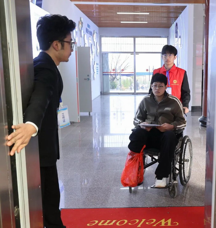 除了高标准的考务工作,学院始终以考生为中心,将人文关怀融入每个细节。考试期间,校园参观、家长专题宣讲会等活动同步开展,搭建起家校沟通的桥梁;爱心护考志愿服务队全程待命,为考生提供咨询引导、应急帮扶等贴心服务。尤为暖心的是,22日上午,一名考生因脚部受伤行动困难,考务组迅速启动应急预案,工作人员与志愿者第一时间协助护送,全程陪护其顺利抵达考场。这一举措不仅解决了考生的燃眉之急,也让家长真切感受到学院的暖心服务。