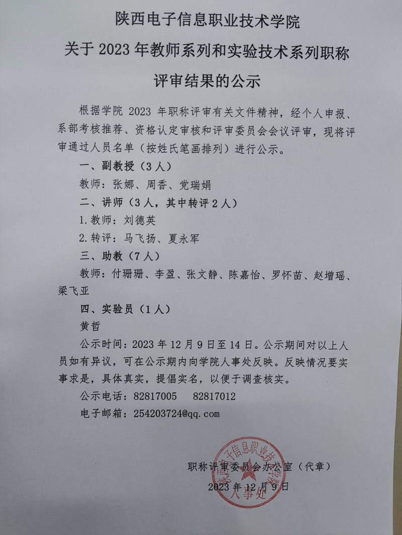 陕西电子信息职业技术学院关于 2023年教师系列和实验技术系列职称评审结果的公示