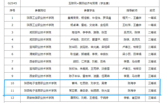 此次技能大赛,学院领导高度重视,多次深入备赛现场,为集训师生加油鼓劲;各指导教师潜心指导,不断优化训练方案,与参赛学生勠力同心;参赛学生刻苦训练,克服各种困难,坚持不懈,沉着应战。在激烈的竞赛中,由陈海宇老师指导,常亚君、唐召奇、帖腮腮、张允宝四位同学组成的第一代表队和曹祎、杜思甜、刘宇龙、吴寒四位同学组成的第二代表队在“互联网+国际经济与贸易”赛项中均发挥出较高的专业素养和竞技水平,最终从激烈的竞争中脱颖而出,分别荣获省级三等奖。