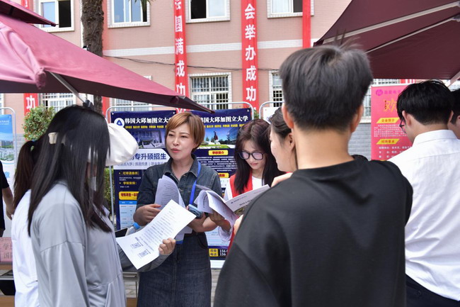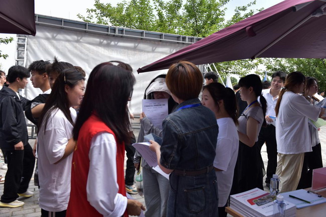 教学楼北侧,彩旗飘飘。参加招聘会企业的展位前人头攒动,前来咨询的学生络绎不绝。他们浏览着、询问着企业的招聘信息、招聘岗位,薪资待遇等等。