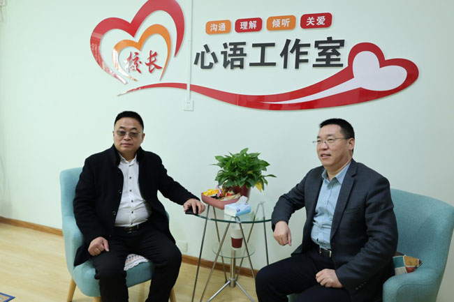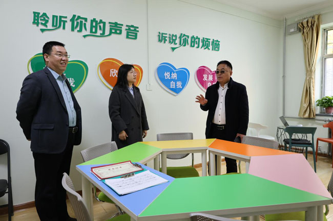 丁晓宝在多功能会议室热情接待了李泽宇一行,教育学院党总支副书记赵双勇、心理健康教育与咨询中心副主任王璐璐和心理教师李亚莉陪同接待。