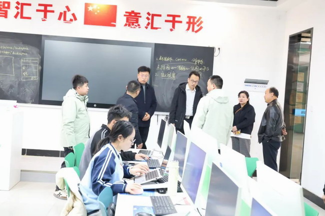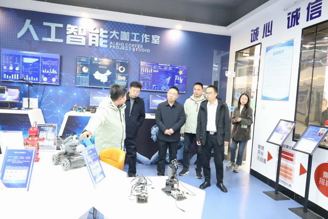 随后,刘学政一行深入校园进行走访调研。春日的校园里,杨柳吐绿,樱花含苞待放,一派生机勃勃的景象。调研组先后参观了学院的人工智能实训中心、校企合作基地以及学生创新创业成果展厅。在现代化教学楼与实训室内,师生们专注地操作着智能化设备,展现出浓厚的学习氛围和良好的教学风貌。