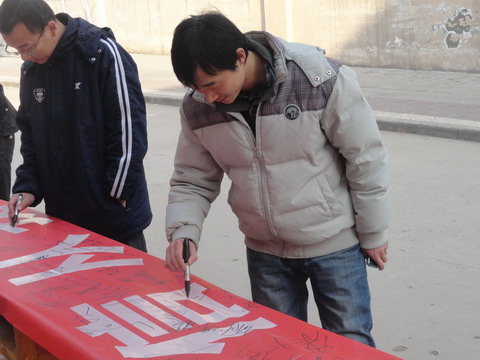 为促进学风考风建设,杜绝考试舞弊等违纪违规现象,院团委于2011年12月16日下午,在学院主干道上举行“诚实守信从我做起、从期末考试做起”诚信考试签名活动。