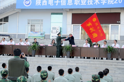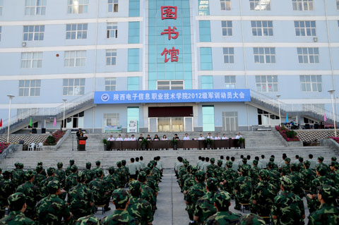 军训动员大会在嘹亮的中国人民解放军军歌声中拉开了帷幕。学生处处长、军训团参谋长田志岗同志宣读了陕西电子信息职业技术学院2012级新生军事训练实施计划。董事长王明亮同志向军训团授予了团旗。新生代表闫亚鹏同学和教官代表崔强强同志先后在大会上发言。