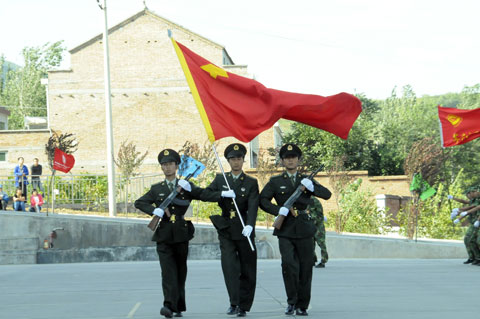 紧接着,军姿威武的2012级新生,排着整齐的队列,迈着整齐的步伐,喊着响亮的口号,依次通过主席台,展现了他们在12天军训中所取得的可喜成果和当代大学生的风采。阅兵式结束之后,进行了新生女子花样队列表演和新生男子拳术基本功表演、教官军体拳表演、新生团体五步拳表演。