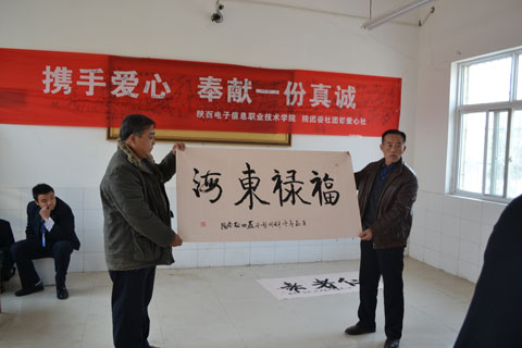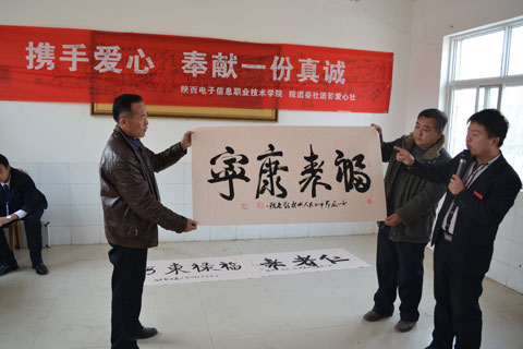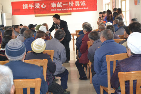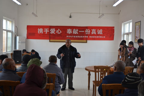为弘扬中华民族尊老、敬老、爱老的传统美德,进一步增强我院学生的社会责任感和爱心意识,2012年11月14日上午,在学院领导的大力支持下,由我院团委爱心社团60多名学生组织的爱心团带着学院爱心人士送上的100余双绵袜、水果、牛奶等营养慰问品,前往蓝田县中心敬老院进行了爱心慰问活动。老人们十分高兴,感动的热泪盈眶。
