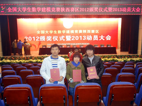 2012年12月13日, 全国大学生数学建模竞赛陕西赛区2012颁奖仪式暨2013动员大会在西京学院举行。陕西省委教育工委、省教育厅副巡视员马万清,陕西赛区组委会主任、西北大学副校长李浩,陕西赛区组委会副主任、教育厅高等教育处副处长井浩等领导出席颁奖仪式。表彰大会由陕西赛区组委会秘书长、西北大学副教授徐哲峰主持,来自陕西省64所高校的领导、指导教师代表和获奖学生500余人参加了颁奖仪式。