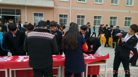 中午12:00整,签名活动正式开始,工作人员在活动场向同学们积极宣传艾滋有关知识,发放相关资料,师生写下自己的爱心寄语、留下了自己的名字,大家用相机留下了动人的画面。此次活动旨在号召全社会积极投身于艾滋病防治工作,共同承担防治责任和义务,群策群力,各展所长,遏制艾滋病的流行。