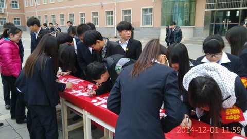 2014年12月1日是第27个“世界艾滋病日”。为进一步贯彻落实《国务院关于进一步加强艾滋病防治工作的通知》要求和《中国遏制与防治艾滋病“十二五”行动计划》,切实推进艾滋病防治工作,结合我院实际,院团委志愿者协会在教学一号楼广场举办了以“行动起来,向‘零’艾滋迈进”(英文主题Getting to Zero),副标题是“共抗艾滋,共担责任,共享未来”的主题签名活动。