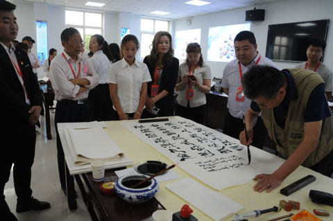 活动现场书香浓郁、墨香四溢。书法家们一边挥毫泼墨,一边向师生详细讲解书法艺术的发展历程、书法的练习技巧等,师生们驻足一旁,聚精会神地观赏创作,现场称赞声此起彼伏。(图/应序康 文/马放奇)