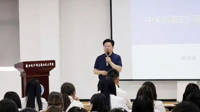 5月23日下午,经贸学院成功举办中美贸易专题报告会。本次活动特邀著名经济学专家赵永泰教授担任主讲嘉宾,学院理事长、院长王明星出席报告会,副院长李泽宇、石晓英及众多师生齐聚一堂,共同聆听这场学术盛宴。经贸学院院长主持报告会。