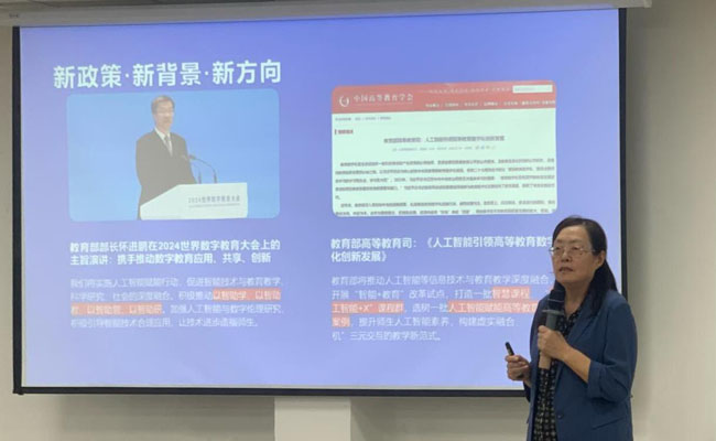 王曙燕在报告中指出“教学改革改到深处是课程,课程的建设与创新是无止境的”,从2010年精品课程、2012年慕课程到2020年一流课程,下一步,教育部将推动人工智能等信息技术与教育教学深度融合,开展 “智能+教育”改革试点,打造一批智慧课程、“人工智能+X”课程群。并分享其智慧教学改革、建设和使用案例,她提出数智赋能的智慧教育是必然的发展趋势,勉励各位老师要创新教学手段、丰富内容,推进课程与时俱进。创建线上线下融合的智慧型学习空间,提升个人的数字素养和智慧化教学能力,增强自我发展能力。增强智慧化环境中的教学设计能力、教学评价能力、知识图谱导学能力和课程思政育人能力。、