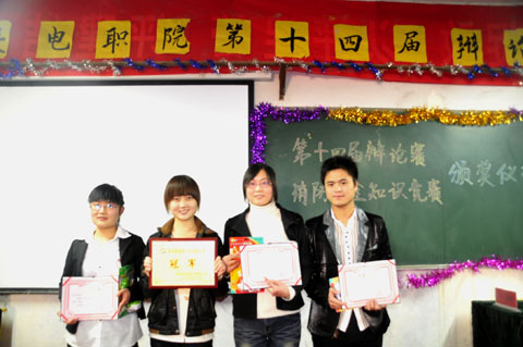 2010年12月3日由院团委主办、学生会学习部承办的“陕电职院第十四届大学生辩论赛”在2号教学楼505教室完美谢幕。