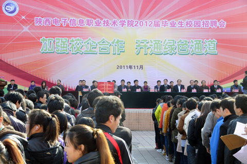2011年11月23日,我院隆重举办了2012届毕业生校园招聘会。学院领导、学生处、教务处、系、部领导和企业代表及全体毕业生出席了招聘会。招聘会由院理事会理事长兼常务副院长穆耀辉主持,院长党惠清致辞,她对毕业生提出了三点要求:一是要保持平稳心态,准确定位。二是要主动出击,相信自己。三是要放眼未来,着眼长远。并希望在本次招聘会上,用人单位能选拔出合适的人才,毕业生能找到适合自己的岗位。企业代表史扬威和学生代表田帅在大会上进行了发言,院党委书记李云济宣布招聘会开始。