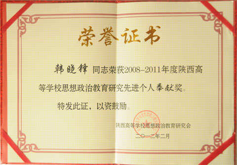 同时,大会表彰了2008—2011年度陕西高校思想政治教育研究会先进集体和先进个人,有9个先进单位和73名先进个人受到表彰,其中我院基础部思想政治教研室韩晓锋老师获得先进个人奉献奖并颁发了荣誉证书,这是我院思想政治教师首次获得省级思想政治教育方面的表彰。