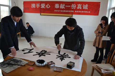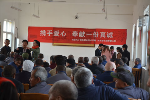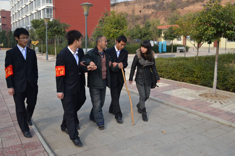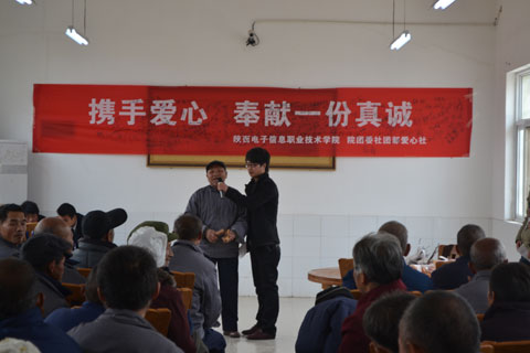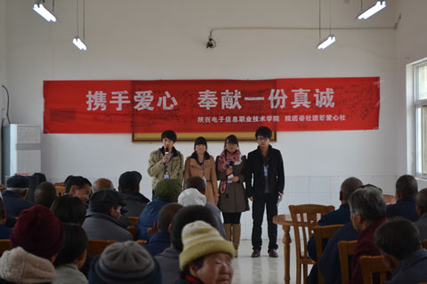 为弘扬中华民族尊老、敬老、爱老的传统美德,进一步增强我院学生的社会责任感和爱心意识,2012年11月14日上午,在学院领导的大力支持下,由我院团委爱心社团60多名学生组织的爱心团带着学院爱心人士送上的100余双绵袜、水果、牛奶等营养慰问品,前往蓝田县中心敬老院进行了爱心慰问活动。老人们十分高兴,感动的热泪盈眶。