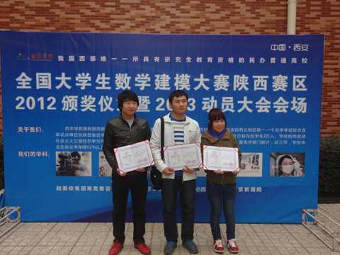 2012年12月13日, 全国大学生数学建模竞赛陕西赛区2012颁奖仪式暨2013动员大会在西京学院举行。陕西省委教育工委、省教育厅副巡视员马万清,陕西赛区组委会主任、西北大学副校长李浩,陕西赛区组委会副主任、教育厅高等教育处副处长井浩等领导出席颁奖仪式。表彰大会由陕西赛区组委会秘书长、西北大学副教授徐哲峰主持,来自陕西省64所高校的领导、指导教师代表和获奖学生500余人参加了颁奖仪式。
