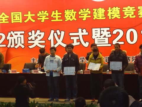 我院教务处刘战鹏处长、基础部翟拴领副主任、数理教研室陈宏老师,以及赵治华、杨波亮、段丽娜3名参赛学生代表参加了颁奖会。赵治华同学代表我院数学建模参赛队上台领奖。