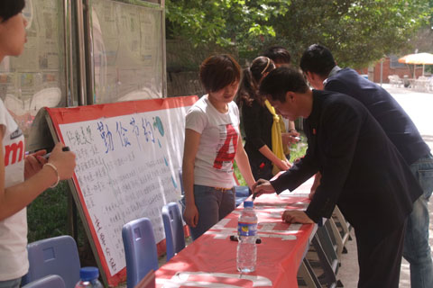 为全面贯彻落实党的十八大精神,厉行勤俭、反对铺张浪费,扎实开展勤俭节约教育,建设节约型校园活动。按照教育部文件要求,结合我院实际,院总务处、院团委于4月15日认真开展了“勤俭节约、从我做起”签名活动——动员大会暨承诺签名仪式。我院学生干部代表曹娇宣读了“光盘行动”倡议书,倡议同学们要从节约粮食开始搞好勤俭节约,反对浪费;树立节约光荣,浪费可耻的思想观念,以“光盘”为荣,“剩宴”可耻,用文明演绎生活,以行动展示形象。