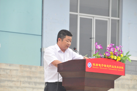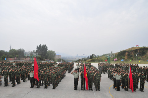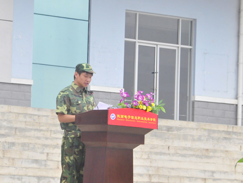 院理事会理事长穆耀辉向军训团授予了团旗。学生处处长、军训团参谋长田志岗宣读了2013级新生军事训练实施计划。军训团副参谋长杨超宣读了“优秀连队、先进个人和文明宿舍”评选办法。新生代表赵锦炎和教官代表王国强先后在大会上发了言。