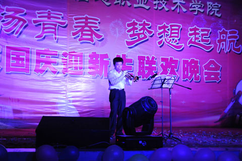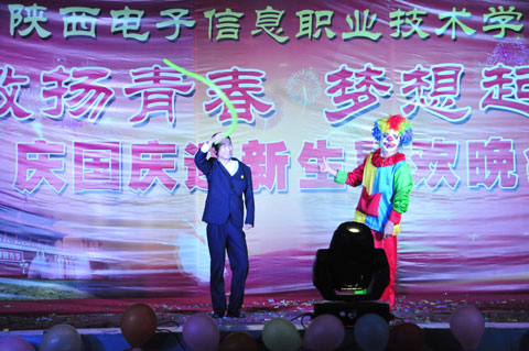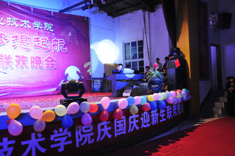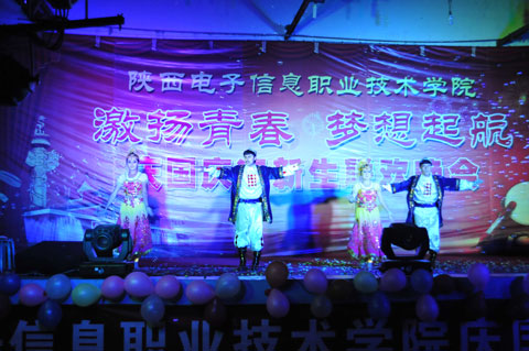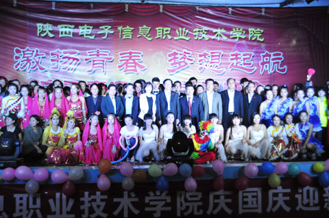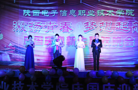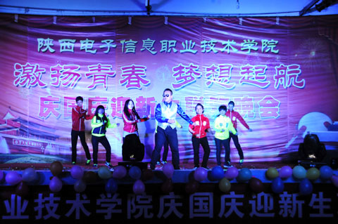 2013年9月27日晚19时,我院2013年庆国庆迎新生联欢晚会在一区大礼堂举行,晚会以“激扬青春 梦想起航”为主题。院党委书记史军胜,院理事会理事长兼常务院长、院党委副书记穆耀辉,副院长夏绘秦,院工会主席杨瑞卿以及各系部处室的领导老师和全院学生共同观看了晚会。