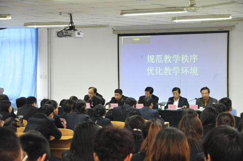 优良的教风学风是确保教学工作规范的基础,是提高教育教学质量的保证。2013年10月28日,我院“规范教学秩序、 优化教学环境月”活动动员大会,在6号教学楼301教室举行。学院领导、全体教职工和学生干部参加了会议,大会由副院长夏绘秦主持。