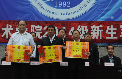 开学典礼上,举行了升旗仪式。院党委书记史军胜宣读了《关于表彰2013-2014学年度先进集体和先进个人的决定》。学生处、基础部和信息工程系3个单位荣获“先进集体”;信息工程系郭薇、张玉林,经济管理系赵静,机电工程系肖焕丽,基础部张蕾、任亲谋,实验中心李小奎,学生处李兴、田金峰、田志岗、赵学伟,党政办公室阎晓萍、亓多、马放奇,教务处周军侠,总务处赵林飞、杜晓科,院工会杨瑞卿等18名同志荣获“先进个人”。主席台就坐的院领导为获奖的先进集体和个人颁发了奖牌及荣誉证书。