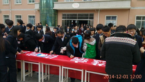 中午12:00整,签名活动正式开始,工作人员在活动场向同学们积极宣传艾滋有关知识,发放相关资料,师生写下自己的爱心寄语、留下了自己的名字,大家用相机留下了动人的画面。此次活动旨在号召全社会积极投身于艾滋病防治工作,共同承担防治责任和义务,群策群力,各展所长,遏制艾滋病的流行。